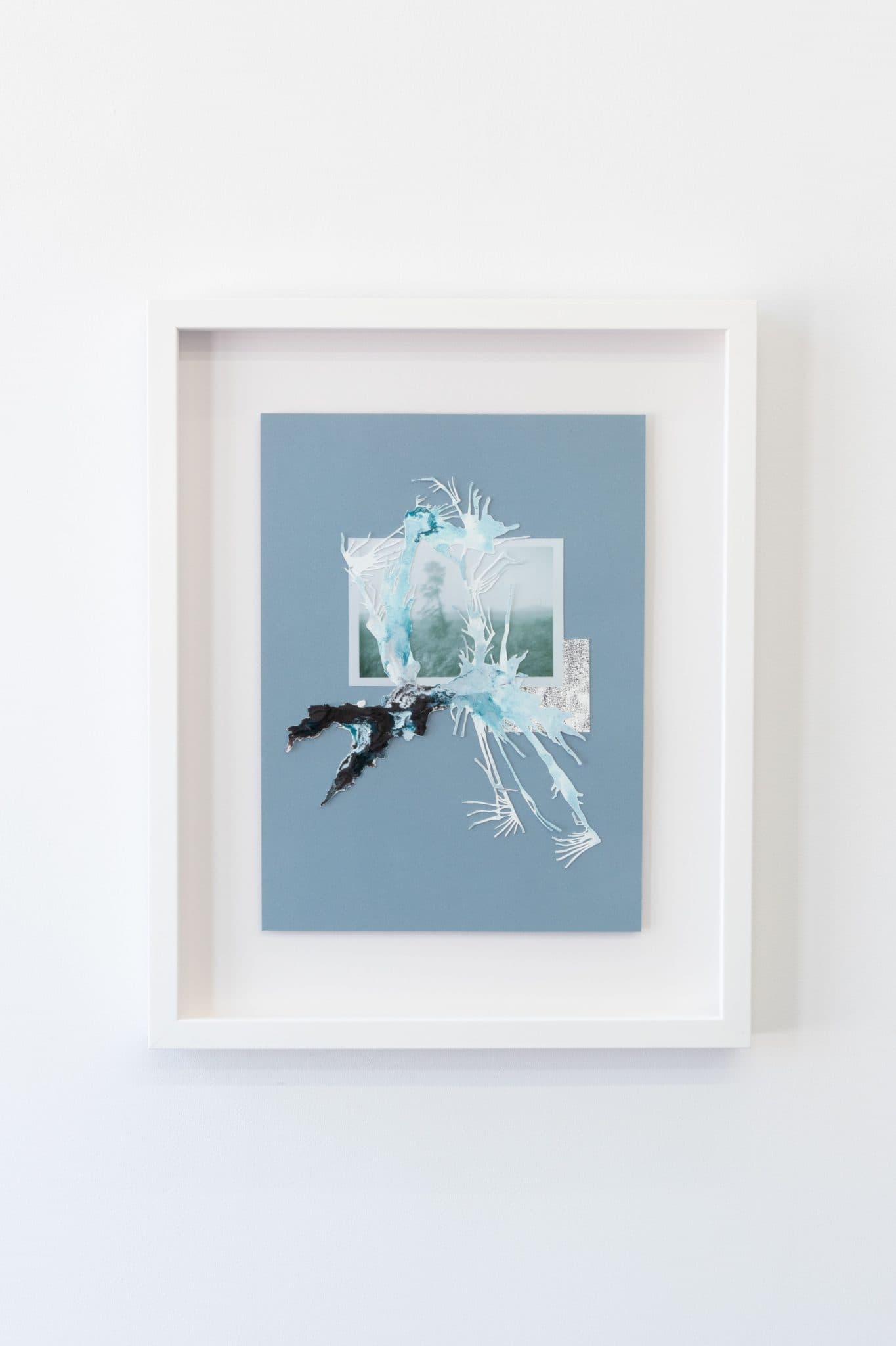 - Ink, Watercolor, Found photo printed on metallic paper, on blue paper